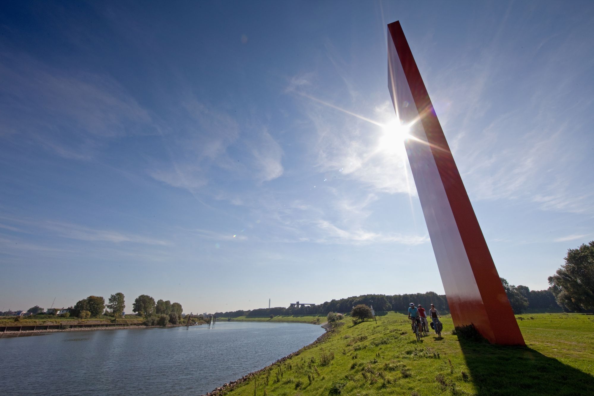 Tief im Westen und in der Tat ein ganzes Stück tiefer als Bochum trifft die allseits beliebte Ruhr auf den alten Vater Rhein. 1992 wurde dieser Zusammenfluss mit der Rheinorange markiert, einer 25 Meter hohen Metall-Skulptur in leuchtendem Orange (Farbton RAL 2004). Die eignet sich gleichermaßen als Fotomotiv oder Zielort einer Fahrradtour. Tatsächlich endet hier der Ruhrtal-Radweg, die Infrastruktur für Zweiräder ist also gegeben.