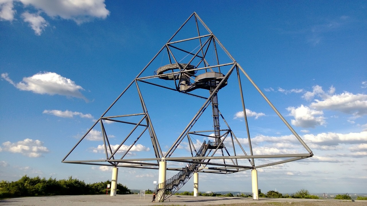 Offiziell nennt es sich Haldenereignis Emscherblick. Ein Blick auf das Gipfelkunstwerk dieser Bottroper Halde genügt aber, um den volksmündisch viel weiter verbreiteten Namen zu erahnen: das Tetraeder. Dieses pyramidenförmige Gerüst kann man über eine Treppe erklimmen, um auf der Aussichtsplattform einzukehren. Im Wind wiegt diese sich gerne mal sanft hin und her, wer aber einen bombastischen Weitblick genießen will, lässt sich davon nicht erschüttern.