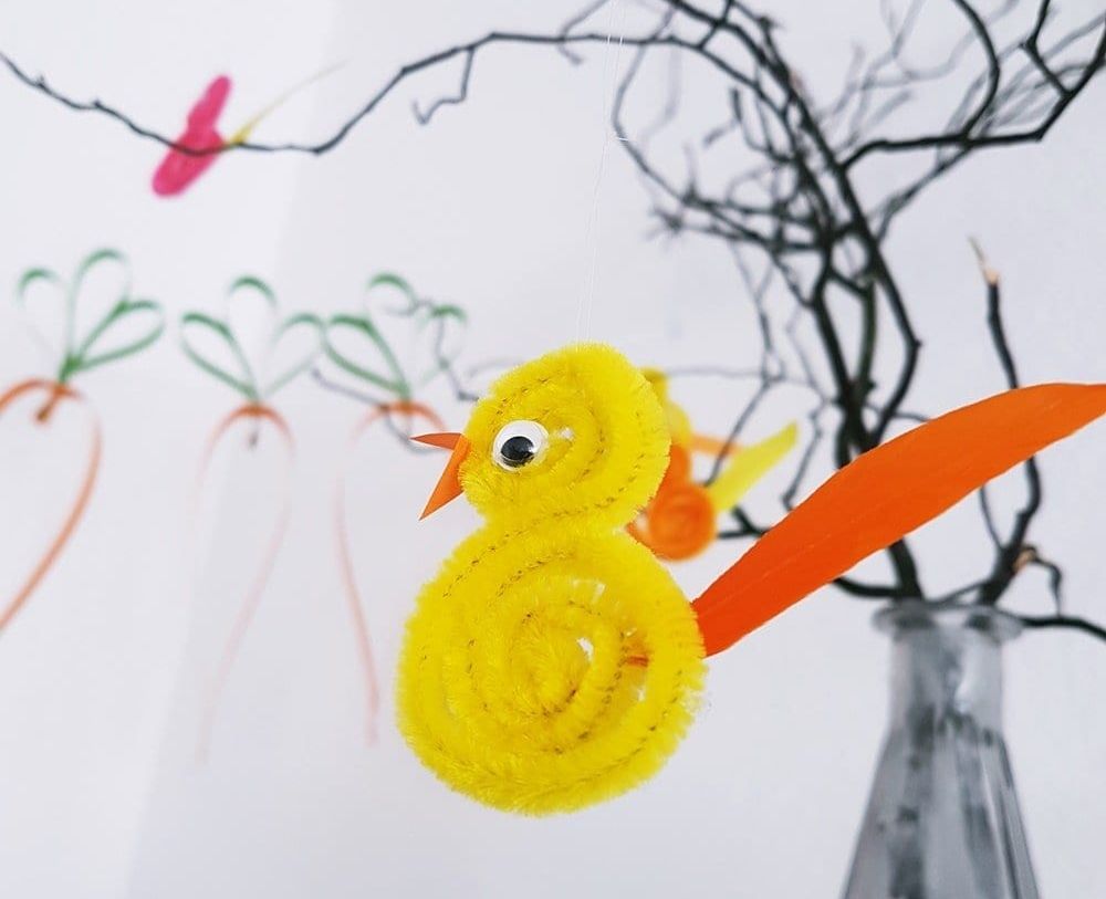 Deko für den Osterstrauch kommt mit dieser Idee vom Blog „Wir testen und berichten“ tierisch bunt daher. Benötigt werden beispielsweise gelbe Pfeifenputzer, die in zwei verschiedene Richtungen eingedreht den Küken-Korpus bilden. Einen Schnabel aus Bastelpapier, ein Wackelauge sowie ‘ne Feder dazu und schon ist der österliche Anhänger für die Äste komplett. Befestigt wird alles mit der Heißklebepistole – natürlich nur von erwachsenen Händen.