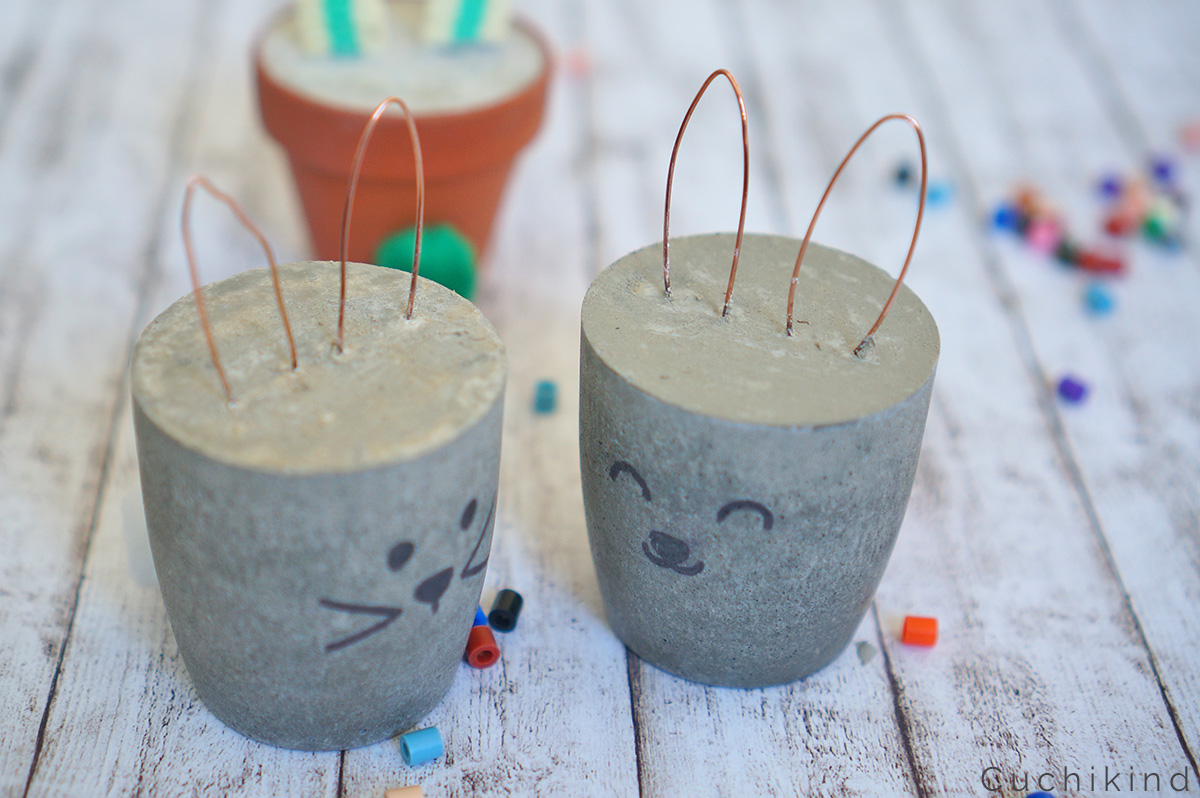 Mit kleinem Aufwand hoppeln (naja, eigentlich stehen sie natürlich fest am Platz) die zuckersüßen Osterhasen aus Beton vom Blog „Cuchikind“ auch bei euch zuhause herum. Schritt eins ist das Anrühren des Kreativbetons, der anschließend in gefettete Joghurtbecher geschüttet und nach circa einer halben Stunde mit in Ohrenform gebogenen Drähten gekrönt wird. Lasst den Beton über Nacht aushärten und malt dann final ein freudiges Gesicht drauf. Ein kleiner Clou: Statt Draht-Ohren verleiht ihr mit schräg hineingesteckten Büroklammern dem Ganzen etwas Praktisches. Zu Ostern haftet so ein Notizzettel mit liebevollem Spruch dran, nach Ostern vielleicht der Einkaufszettel.