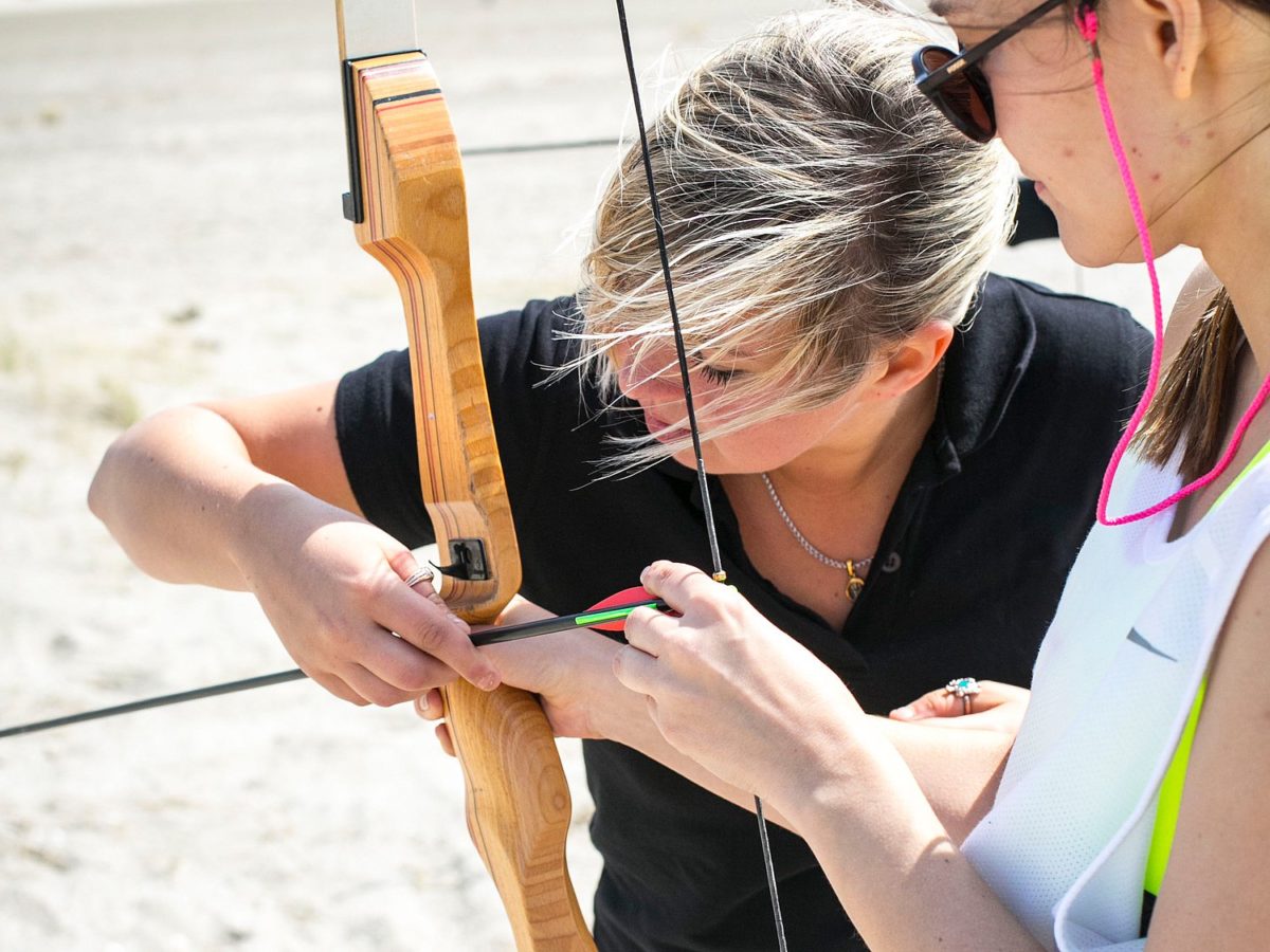 Direkt beim wunderschönen Fühlinger See könnt ihr euch fühlen wie Robin Hood und Co.! Nach einer kleinen Einführung geht es sofort ans Schießen. Mag es am Anfang noch etwas schwierig sein, werdet ihr euch schnell verbessern und mit den Pfeilen ins Schwarze – oder wie in diesem Fall in die gelbe Mitte der Scheibe – treffen. Bogenschießen mit Sand unter den Füßen.