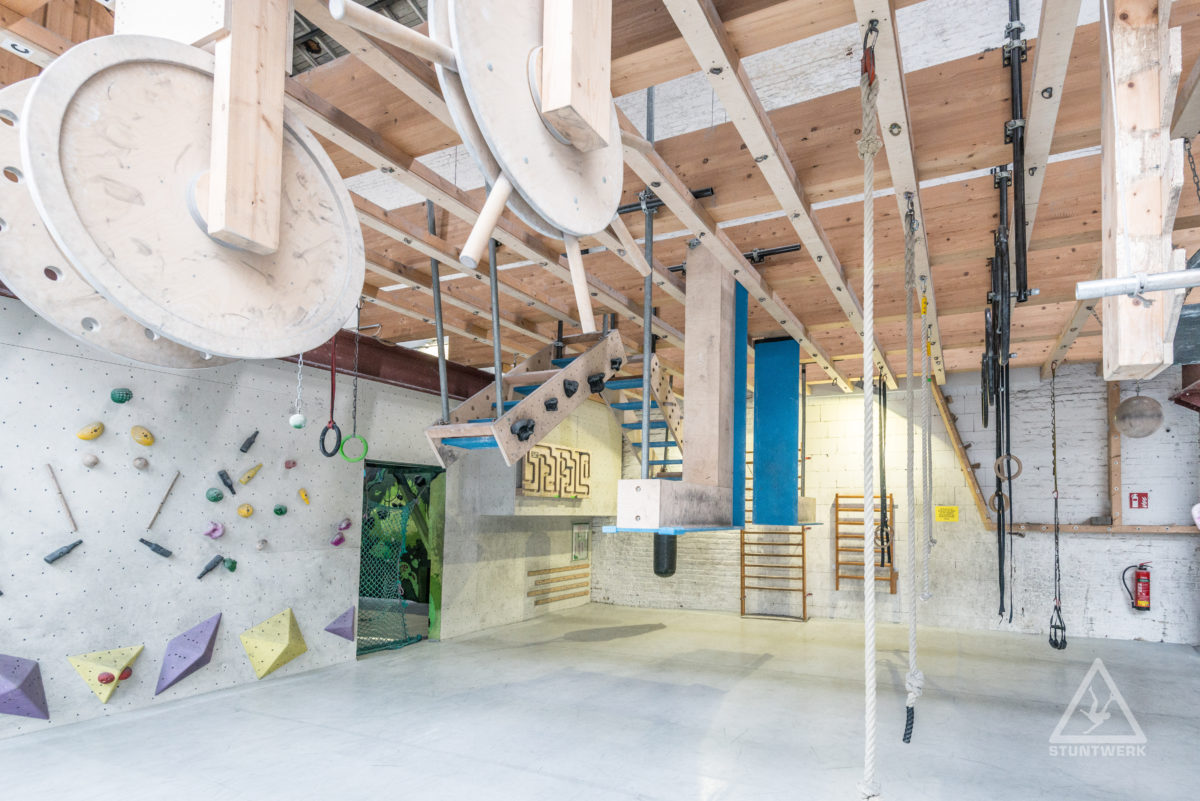 Hier sollt ihr natürlich keine Stunts absolvieren, bei manch einem waghalsigen Manöver kann es beim bouldern aber schon einmal fast so aussehen. Im Stuntwerk gibt es sechs verschiedene Level, alle sind mit unterschiedlichen Farben gekennzeichnet. Außerdem gibt es ein Überraschungsparcour mit der Farbe lila. Hier sind alle Level durchmischt. Ein besonderes Schmankerl ist auch die Wettkampfwand an der ihr euren Boulderpartner herausfordern könnt!