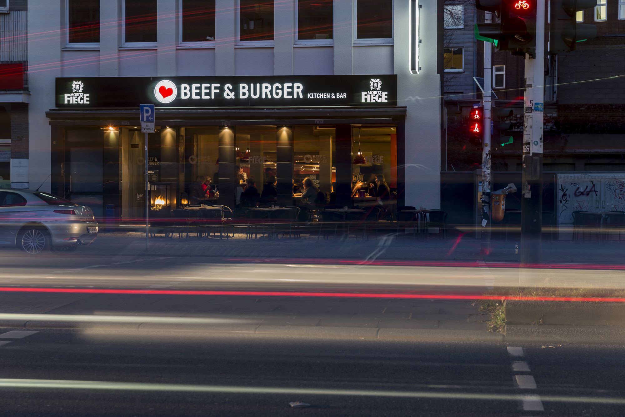 Im Beef & Burger hat man sich ganz der Veredlung von Rindfleisch verschrieben. Die Burgerpatties werden in 180-Gramm-Portionen frisch vor Ort gewolft, zubereitet und mit allerlei Extras versehen. Die Standardkarte bietet dabei Gewohntes, also Classic, Cheese oder BBQ, wohingegen die Specials in regelmäßigen Abständen mit ungewohnten Belägen wie Kresse-Mayo, karamellisierten Birnenspalten oder Pilzragout aufwarten. Daneben gibt es auch noch eine kleine Auswahl an Geflügel- und Veggie-Burgern.