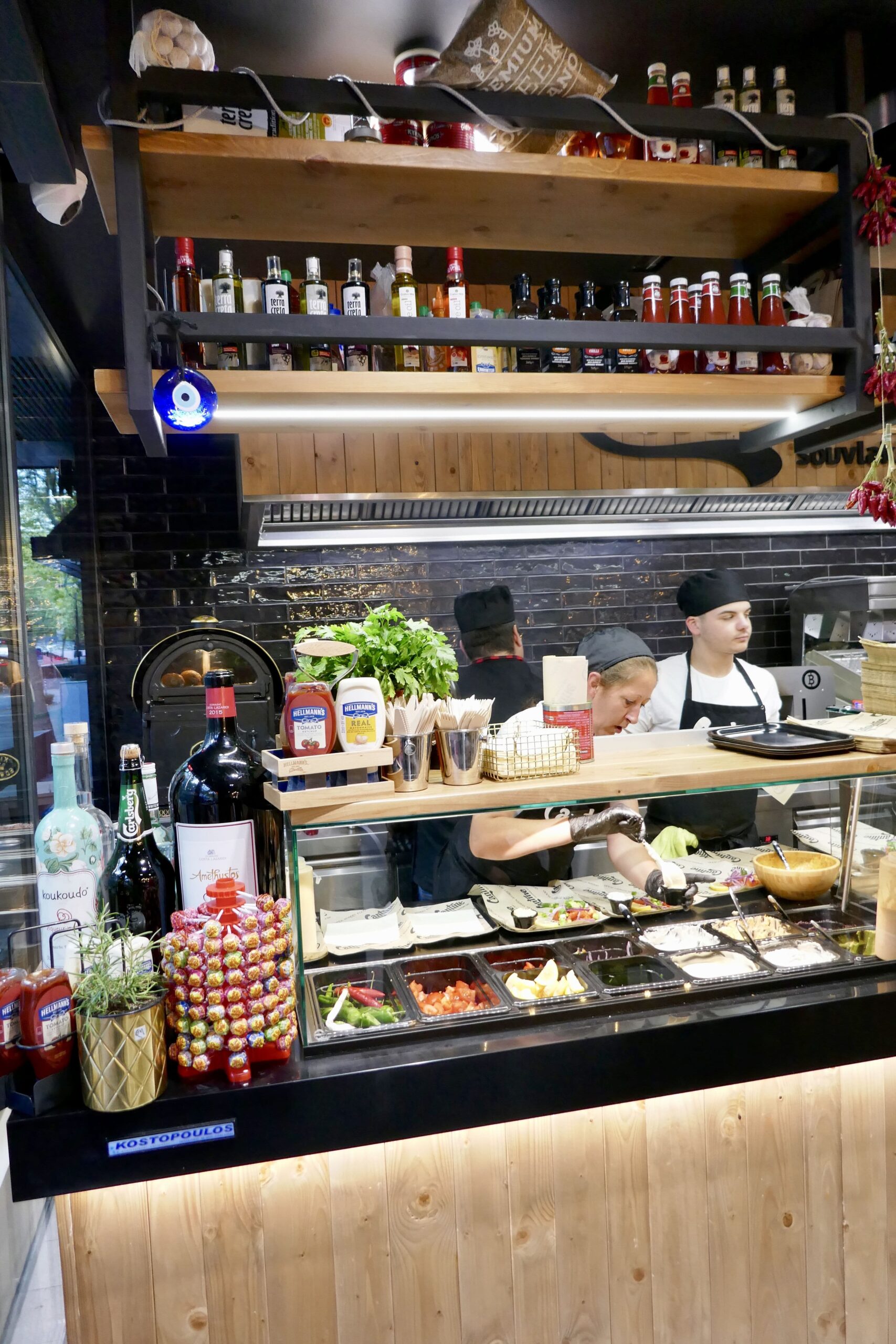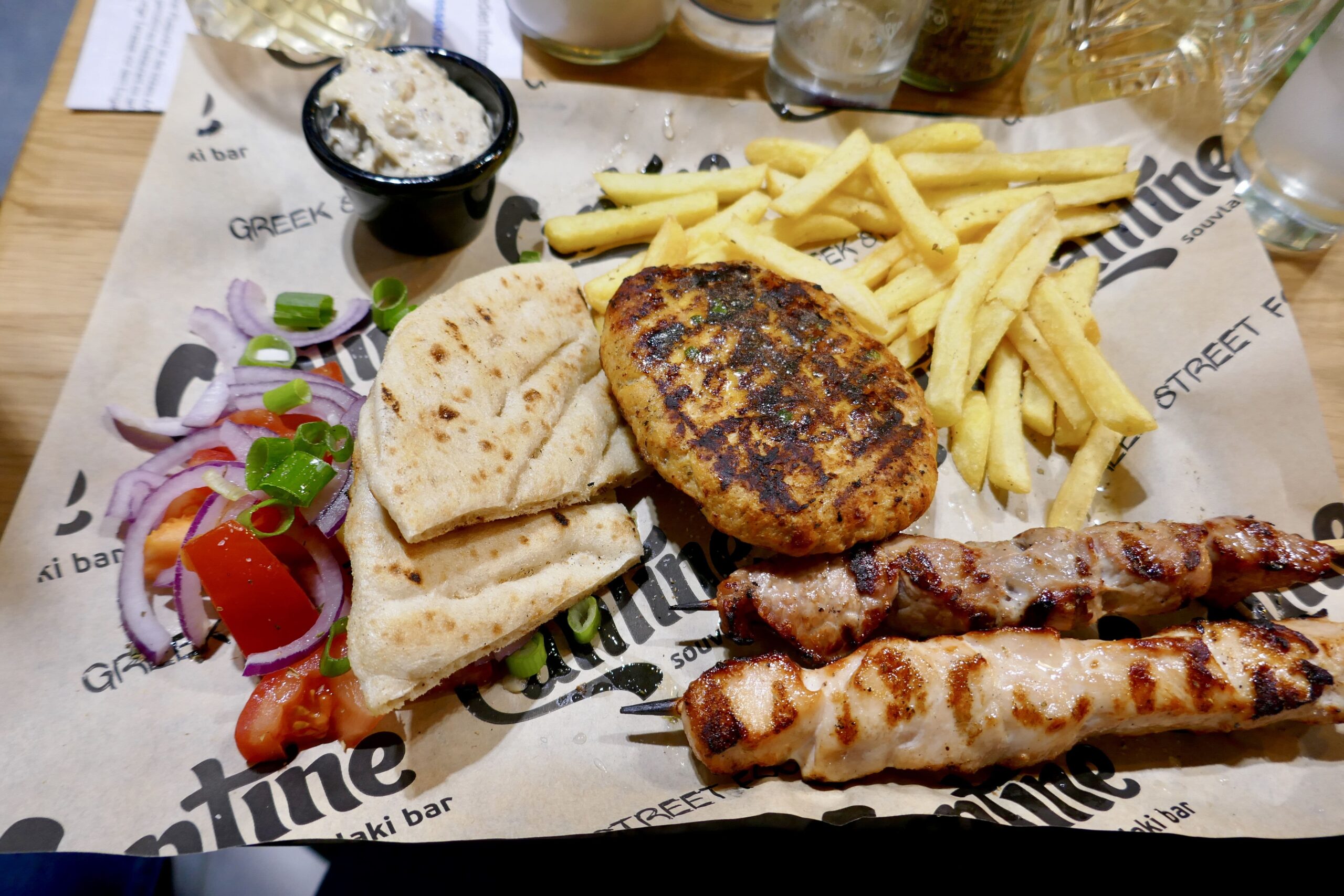 Man darf aufgrund der offenen Küche auch dabei zusehen, wie das Essen zubereitet wird. Gegessen wird an recht einfachen Holztischen, auch auf der Straße stehen einige Sitzgruppen bereit. Es gibt die Klassiker, wie naturgemäß die namensspendenden Spieße Souvlaki, aber auch Bifteki (gefüllt mit Frischkäse; sehr überwältigend), Grillkäse, Landwurst (authentisch fettig, gut) , Fritten (in einer Art Schaufel serviert) und auch die Pita-Tasche. Aber auch diverse Burger, Sandwiches oder der Beyond Burger stehen da auf der Speisekarte.