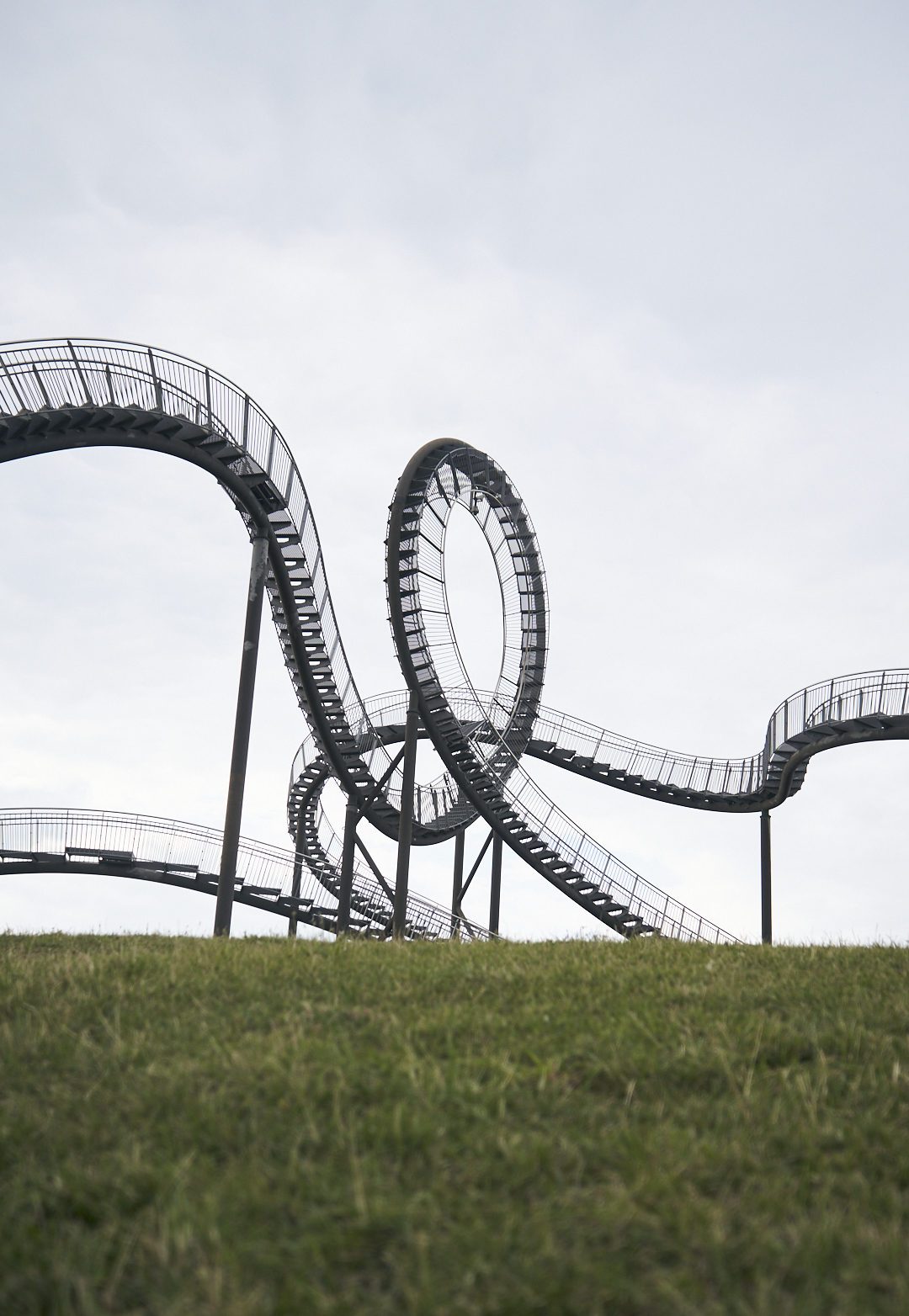 Pottgetreu endet unser Tag im westlichen Ruhrgebiet auf einer Halde. Die Heinrich-Hildebrand-Höhe wird von der begehbaren Achterbahn-Skulptur „Tiger & Turtle – Magic Mountain“ der Kunstschaffenden Heike Mutter und Ulrich Genth gekrönt. Auch wenn diese momentan wegen der Corona-Pandemie nicht erklimmbar ist, lohnt der Gang auf die Halde. Von hier aus genießen wir nämlich den Ausblick über die Industrielandschaft der Stadt, erspähen sogar markante Landmarken Mülheims und Düsseldorfs.