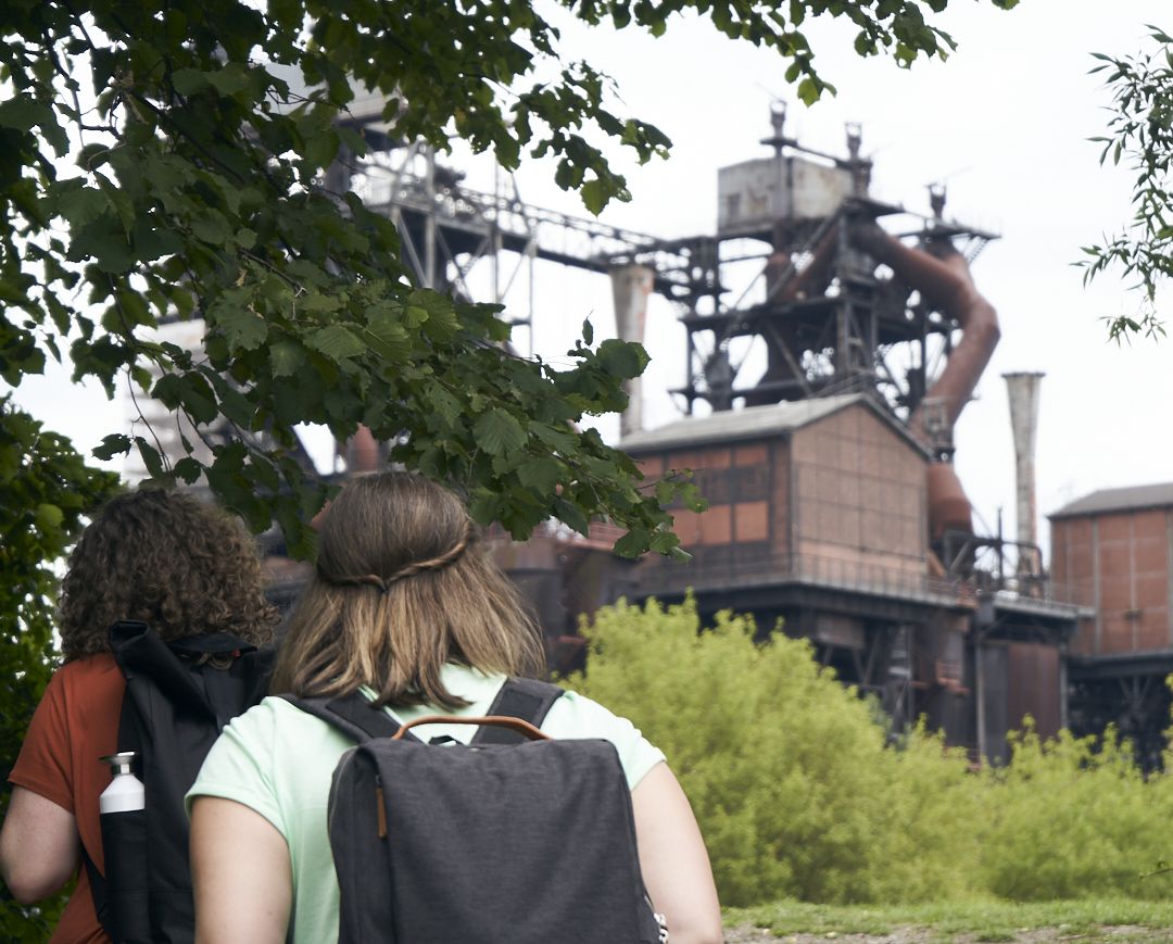 Uns fesselt gleich zu Beginn der Hochofen 5, der mit 70 Metern Höhe auf dem Gelände imponiert. Von der begehbaren Aussichtsplattform genießt man normalerweise (derzeit ist der Aufgang Corona-bedingt geschlossen) einen weiten Blick. Der Weg führt uns vorbei an ausgedienten Vorratsbunkern zu zwei Rundklärbecken, die heutzutage als Teich fungieren. Gräser und eine bunte Blütenpracht sorgen für malerische Bilder vor stählerner Kran-Kulisse. Eines der beliebtesten Fotomotive dürfte auch das angrenzende Kühlwerk mit seinen farbigen Lüftern sein, die sich spielerisch bei Wind bewegen.