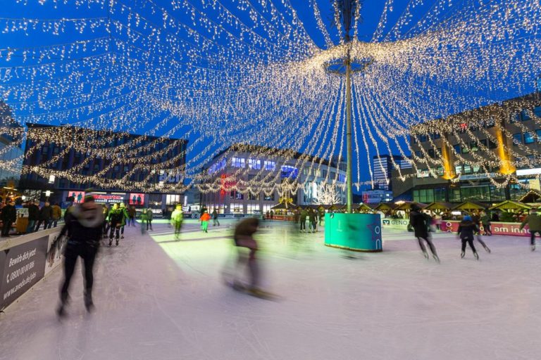 Im Schatten des beeindruckenden Remscheider Rathauses vereisen während des Weihnachtsmarktes über 600 Quadratmeter. Selbstredend, dass diese mit Schlittschuhen befahren werden können. Zudem locken zwei Eisstockbahnen auf die von Holzhütten und Lichterketten umgebene Eislaufbahn. Die können online für 59€ gebucht werden.