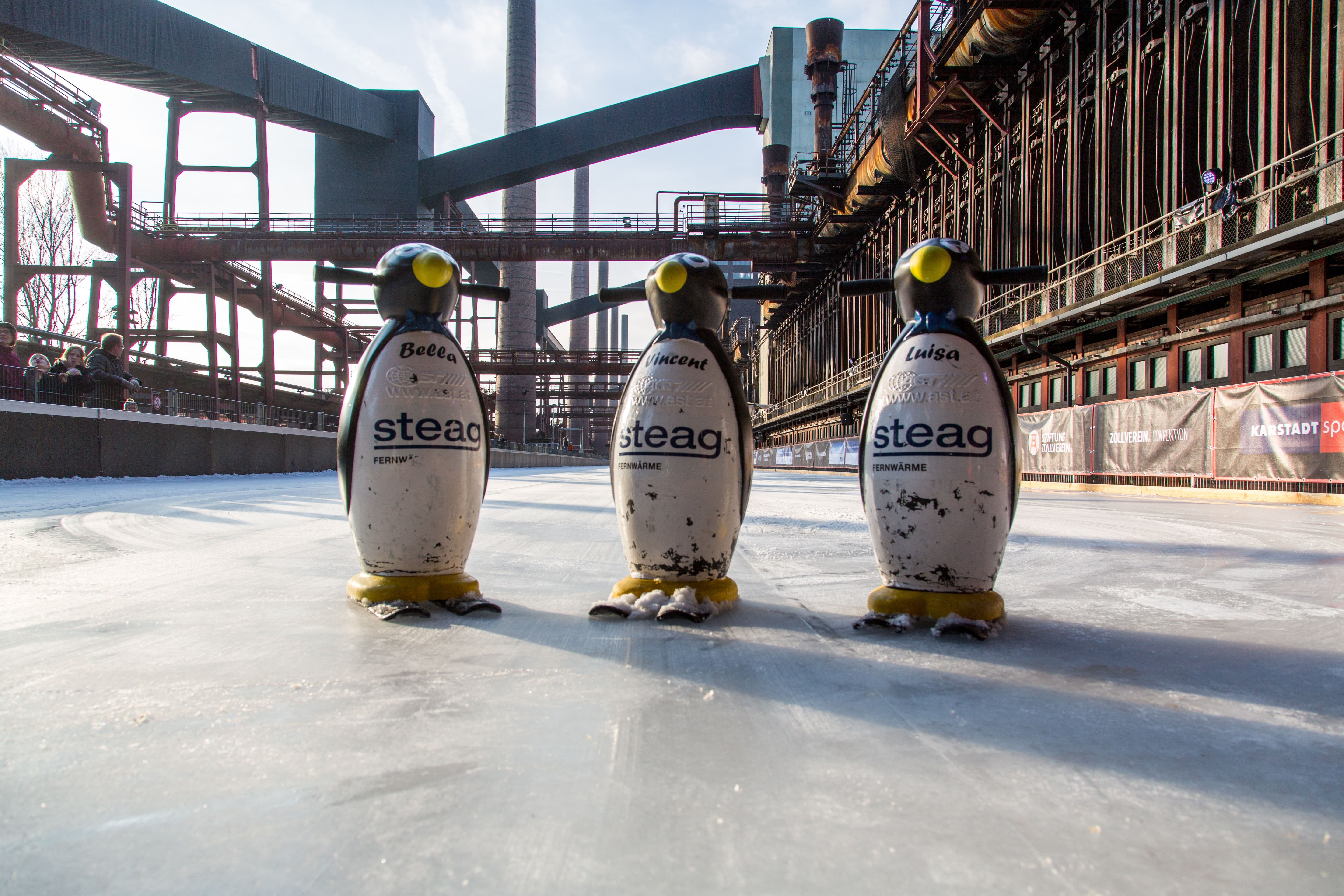 Ein Ort von Eis und Feuer: Wo einst in Koksöfen Kohle brannte, wird heute in der Winterzeit auf einer 1800 Quadratmeter großen Eisfläche geschliddert. Und das nicht im Schein lodernder Flammen, sondern im bunten Glanz einer Lichtinstallation. Wer sich die Kufen hier anschnallt, kann Bahnen fahren, bei den Eisdiscoterminen (14.12.+4.1.) tanzen, sich im Eisstockschießen üben oder nen ruhigen Plastikpinguin schieben.