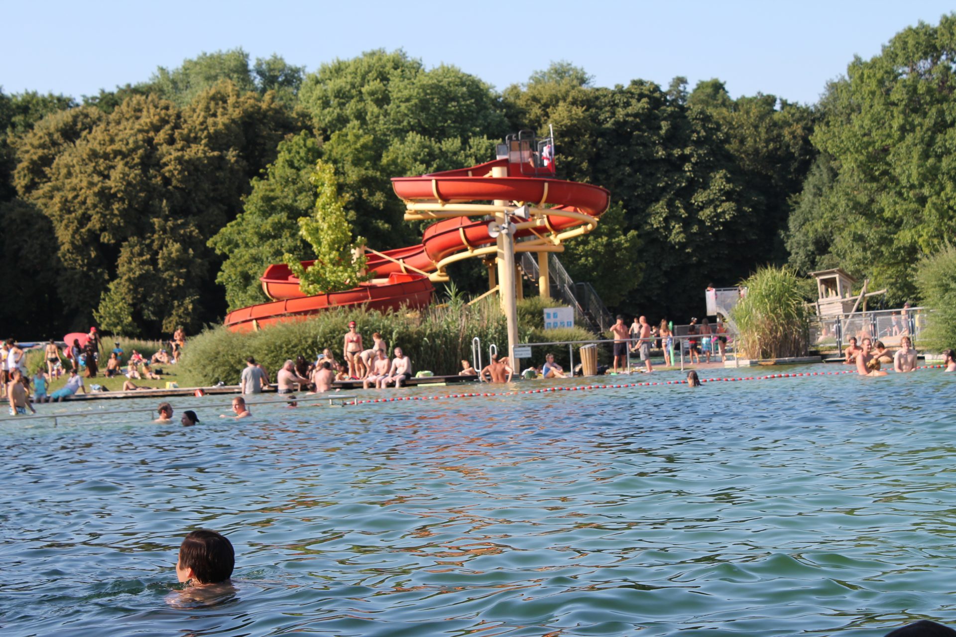 Im Mittelpunkt des schlanken, länglichen Streifens kühlen Nasses steht zwar der Funsport auf Wasserskiern, nichtsdestotrotz kann im Strandbad auch geplanscht werden. Während man genüsslich dümpelt oder gesellig auf der Wiese lümmelt, hat man beste Sicht auf klumpige Stuntversuche oder versierte Trickreißer.