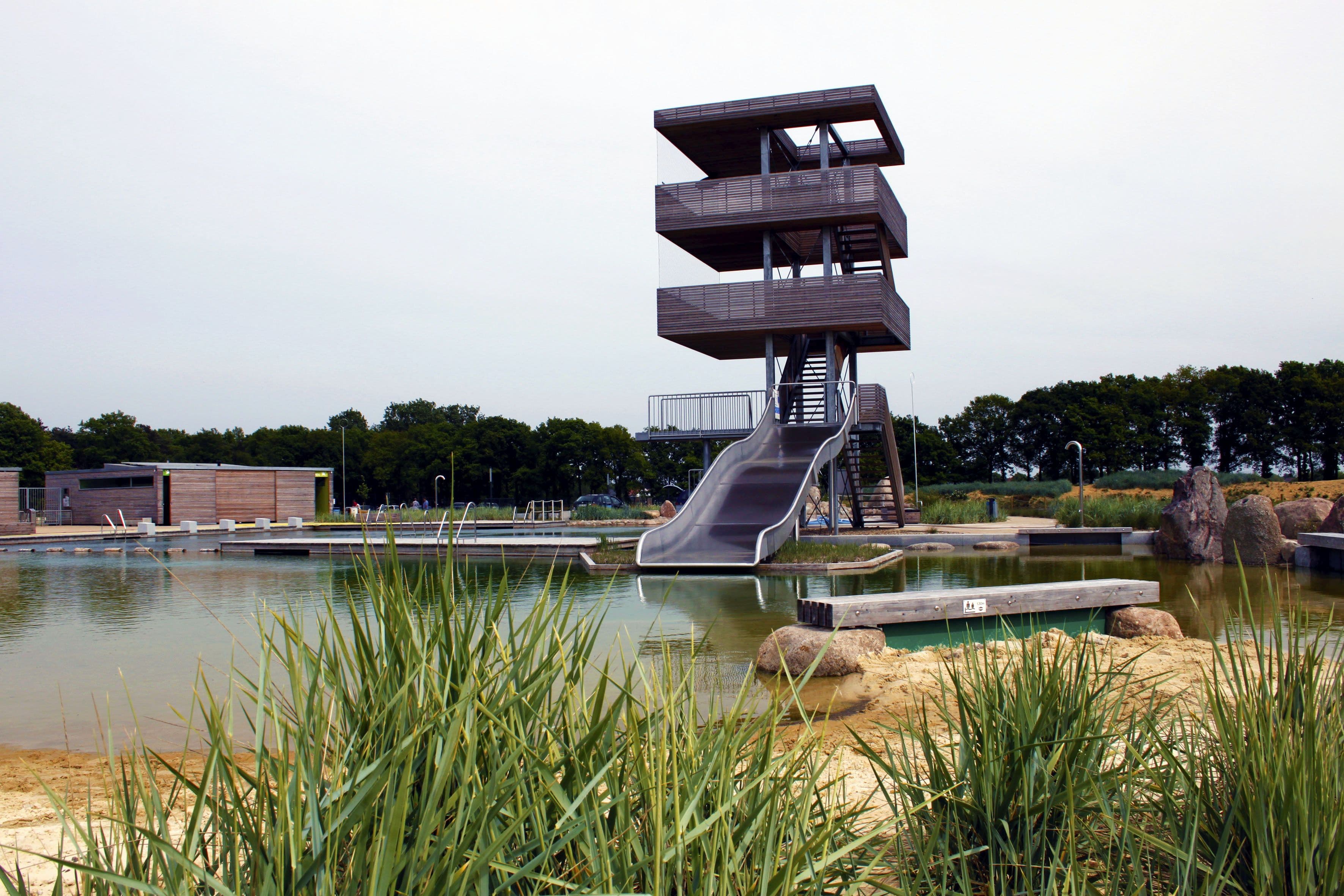 Dünengras, grober Sand und Findlinge säumen die Uferlinien der Schwimmbecken im überregional beliebten Olfener Naturbad. Das klare Wasser mit gesunder Grüne ist chlor- und chemiefrei, die Gewässersäuberung übernehmen Sandschichten und Röhricht – übrigens eine Methode, die das Wasser länger warm hält. Gebadet wird in modern-stylischen Becken mit Stein und Holzelementen, Entspannung findet man in Strandkörben oder an Massagedüsen. Amüsement verschaffen ein Wasserspielplatz für Groß und Klein oder der Sprung-Turm mit einzigartiger Schachteloptik und integrierter Rutsche. Rundum eine beachtenswerte Institution in Sachen naturnahes, modernes Badeerlebnis.
