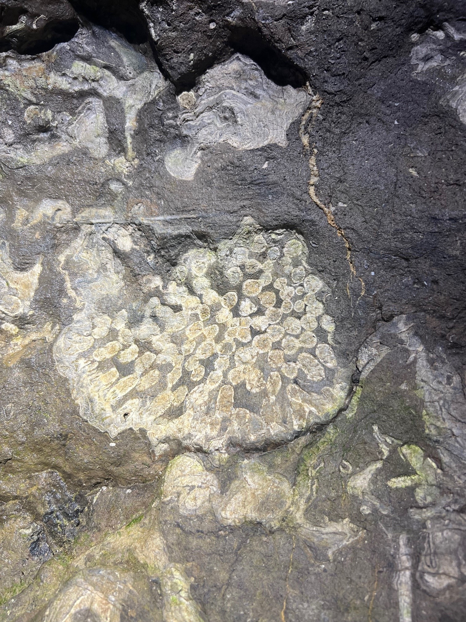 Es geht weiter hinein in die Kluterthöhle. Die teils sauber erkennbaren Gesteinsschichten werden von einem ungewohnten Anblick abgelöst. Weiße Flecken übersäen die Gänge. Sarah Droska erklärt: „Wir sind hier mitten im Korallenriff. Jeder dieser Flecken war eine Koralle, ein Schwamm oder auch eine Schnecke, Muschel oder Perlboot.“ Ich erkenne winzige Kämmerchen und zarte Röhren im Gestein. Eine Schlammlawine, erzählt Droska, hat vor Millionen von Jahren das Riff bedeckt und es so für die Nachwelt quasi versiegelt.