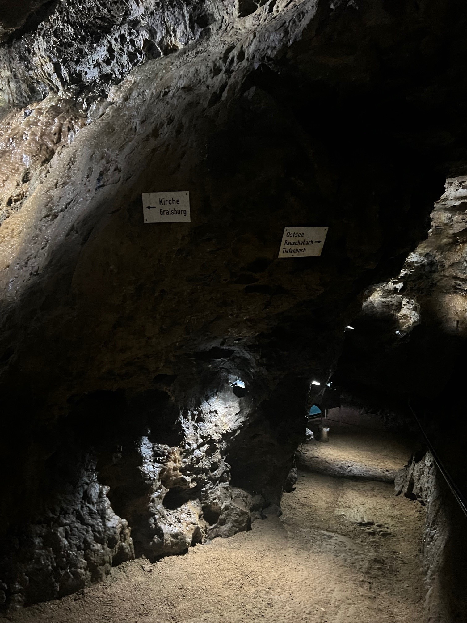 Geradezu bizarr mutet es an, als uns regelmäßig Stühle und Liegen begegnen, die in den Gängen verteilt sind. Droska führt dazu aus: „Die Höhle wird schon seit Jahrzehnten für Therapien benutzt. 1950 entdeckte August Bartz, dass die saubere Luft bei Atemwegserkrankungen hilft. Die Menschen können hier unten einfach besser atmen. Mittlerweile haben wir auch viele Long Covid-Patienten.“ Nicht nur die reine Luft der Höhle wird genutzt, sondern auch ihr einmaliger Klang. „Hier finden auch öfter Konzerte statt. Die Höhle bietet einfach ein einmaliges Ambiente und damit außergewöhnliche Erfahrungen.“