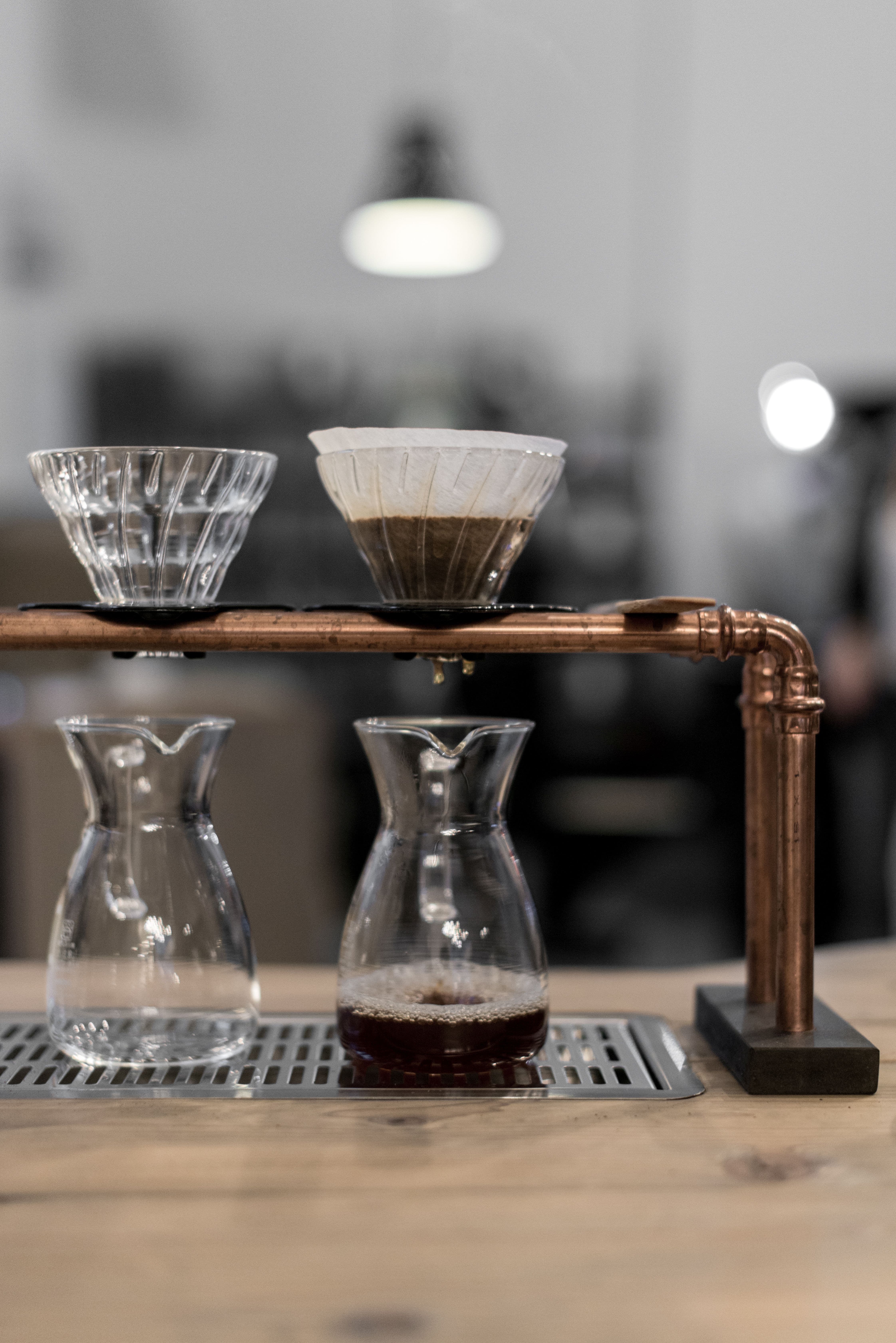 Die Filtervorrichtung aus Glas und Kupferrohren hat etwas industrielles, ebenso die klare, minimalistische Einrichtung des Lokals, das durch Holz und Metall Akzente setzt. Dabei ist das, was letztlich in kleine Karaffen tropft, weit entfernt von Industriekaffee.