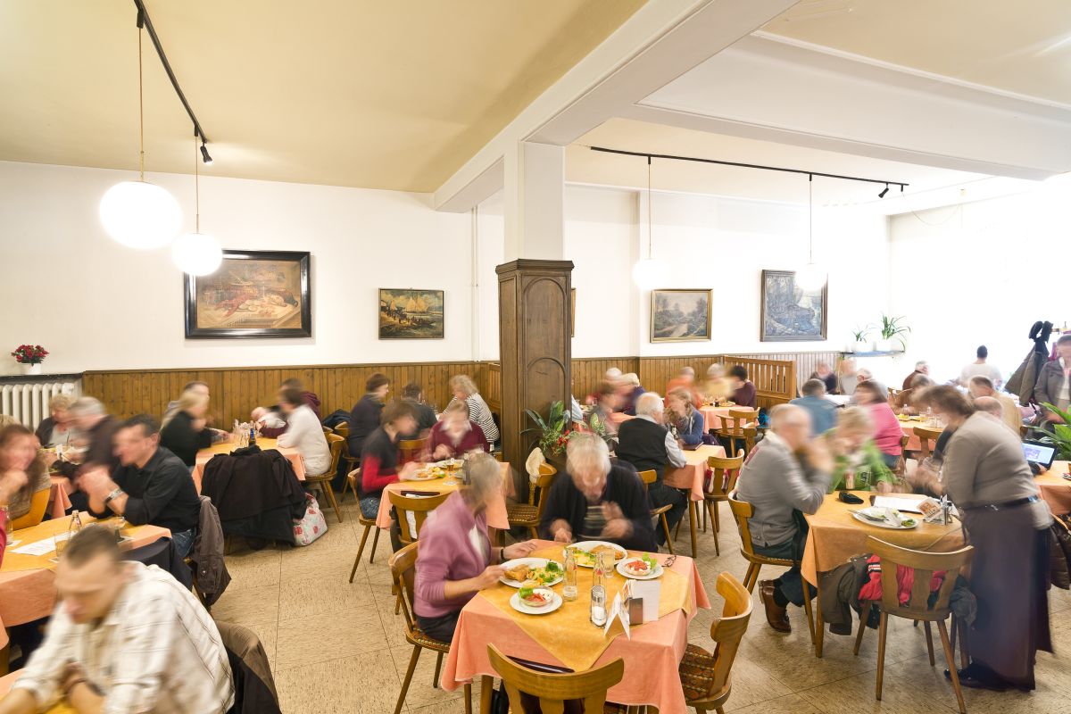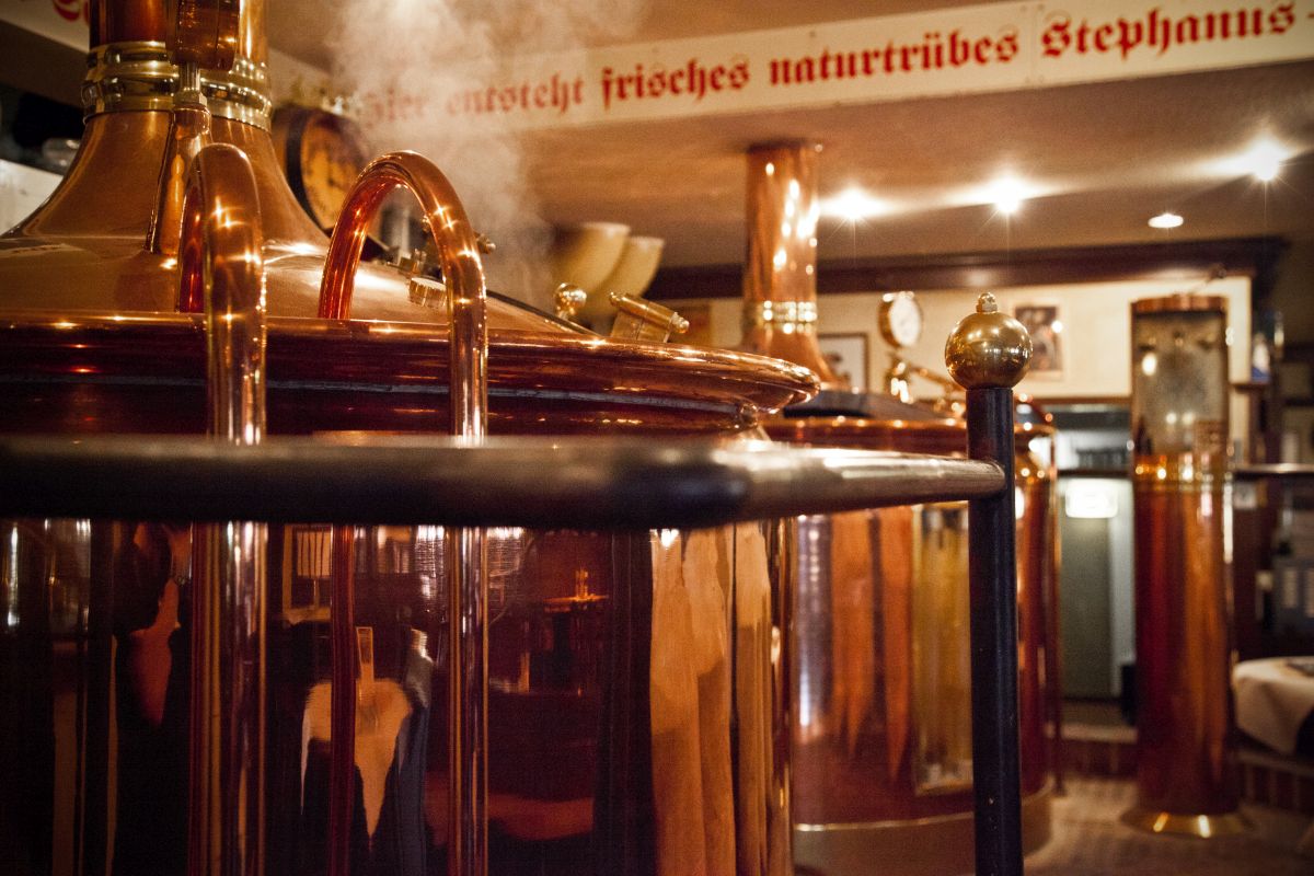 Was hier getrunken wird, ist klar. Stephanus-Bräu fließt aus den Hähnen direkt in die durstigen Kehlen. Für die Grundlage sorgt das Küchenteam mit Leckereien wie Kalbshaxe, Ochsenbacke oder Schaufelbraten, die so deftig sind, wie sie klingen. Auch Schinkenplatte, Bratwurst oder Flammkuchen stehen im Menü. Überraschend ist die große vegetarische Auswahl und die (für ein Brauhaus) diversen angebotenen Weine. Prost!