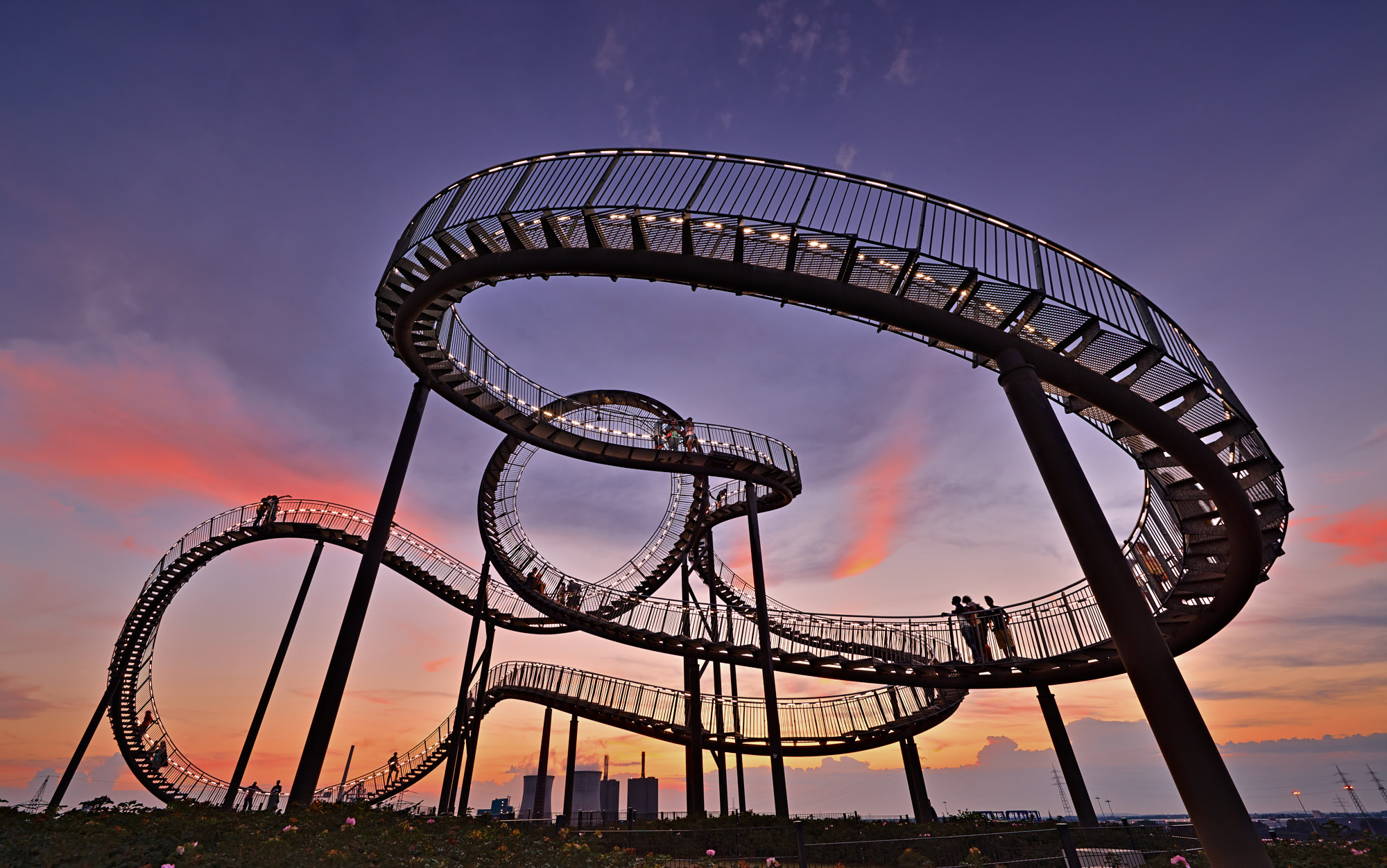 Wie bei allen Halden im Revier dreht sich auch bei der Duisburger Landmarke Tiger & Turtle – Magic Mountain vieles um die Aussicht: Wenn es das Wetter erlaubt, wandert der Blick von der rund 20 Meter hohen Konstruktion bis nach Düsseldorf. Hauptsächlicher Anziehungspunkt dürfte allerdings die begehbare Skulptur selbst sein, die sich da auf der Heinrich-Hildebrand-Höhe im südlichen Duisburg in den Himmel streckt. Die an eine Achterbahn erinnernde Stahlarbeit stellt mit ihren Loopings und Windungen ein äußerst beliebtes Fotomotiv dar; nachts setzen 880 LEDs das überregionale Wahrzeichen in Szene. Erschaffen wurde die Konstruktion von den Künstlern Heike Mutter und Ulrich Genth im Zuge der Kulturhauptstadt Ruhr.2010 – von ihrer Strahlkraft hat sie bis heute nichts verloren.