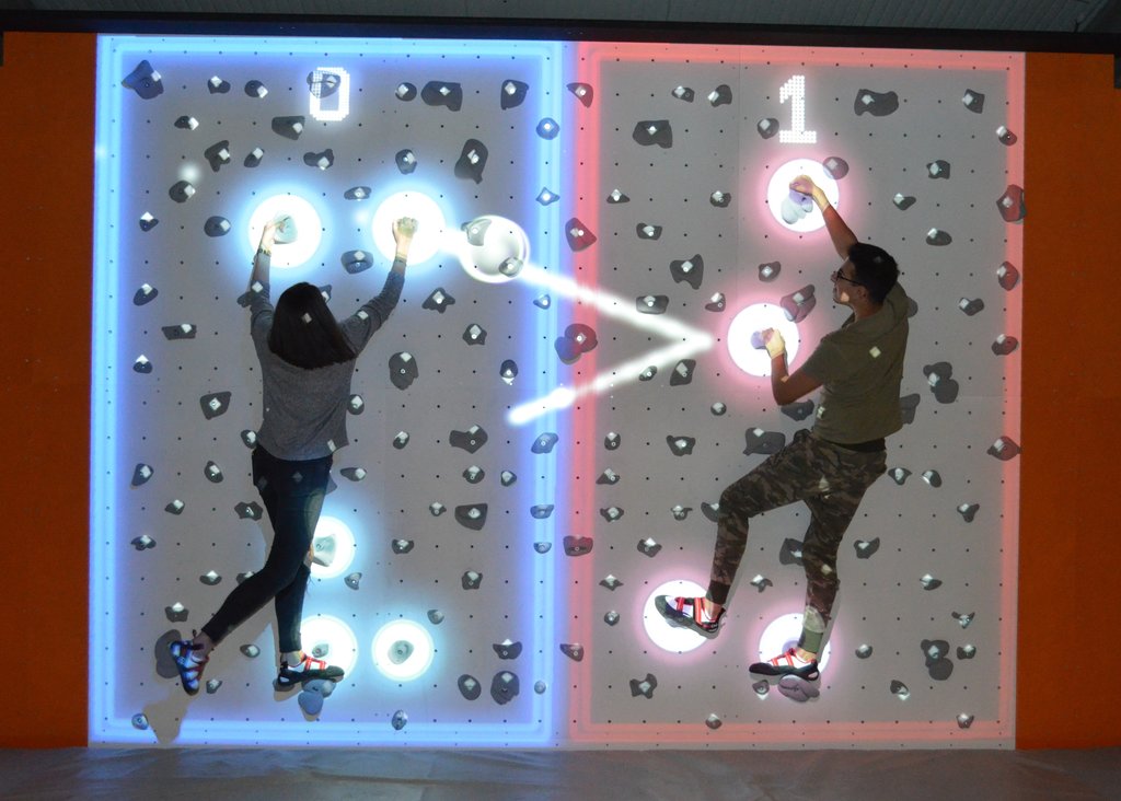 Interaktives Gaming und Sport – klingt seltsam? Nicht doch! Beim Augmented Climbing wagt ihr euch ohne Sicherung auf die Kletterwand, ein Beamer projiziert die Spielfläche und beleuchtet die Positionen, die ihr berühren müsst, um im Spiel weiterzukommen. Durch die Vielzahl an unterschiedlichen Games und Levels können hier alle mitmachen, egal, wie es um Körpergröße oder die persönliche körperliche Fitness gestellt ist. Auch super als Teamevent!
