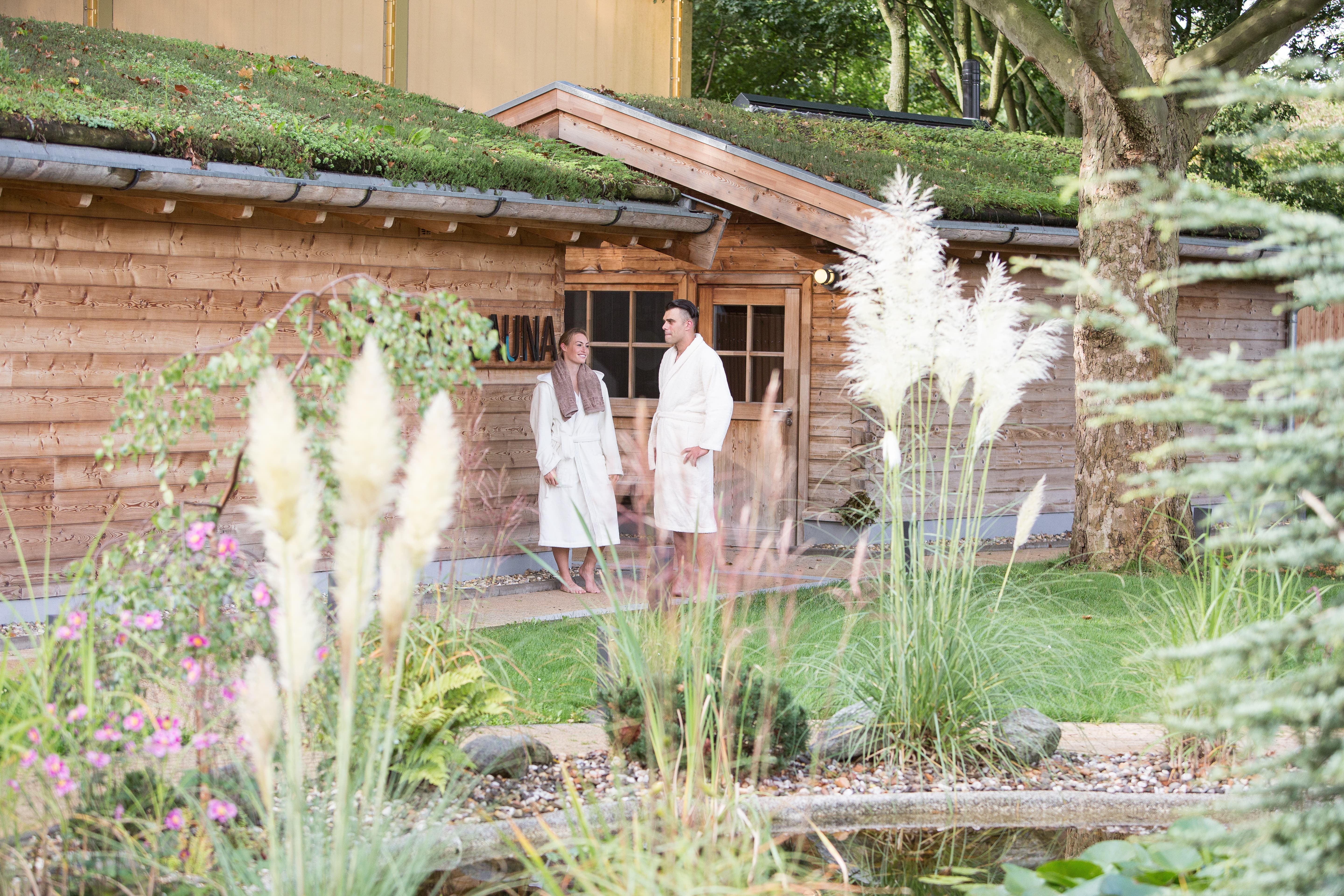 Die modernen Gebäude der Wellness-Oase im beschaulichen Neuss sind um einen Naturbadesee versammelt. Zum Saunabereich gelangt man durch einen verglasten Gang, dort warten acht Saunen, etwa die Schilf-, die Salz- oder die Erdsauna. Im Kaminhaus lässt es sich derweil vortrefflich am knisternden Feuer entspannen.