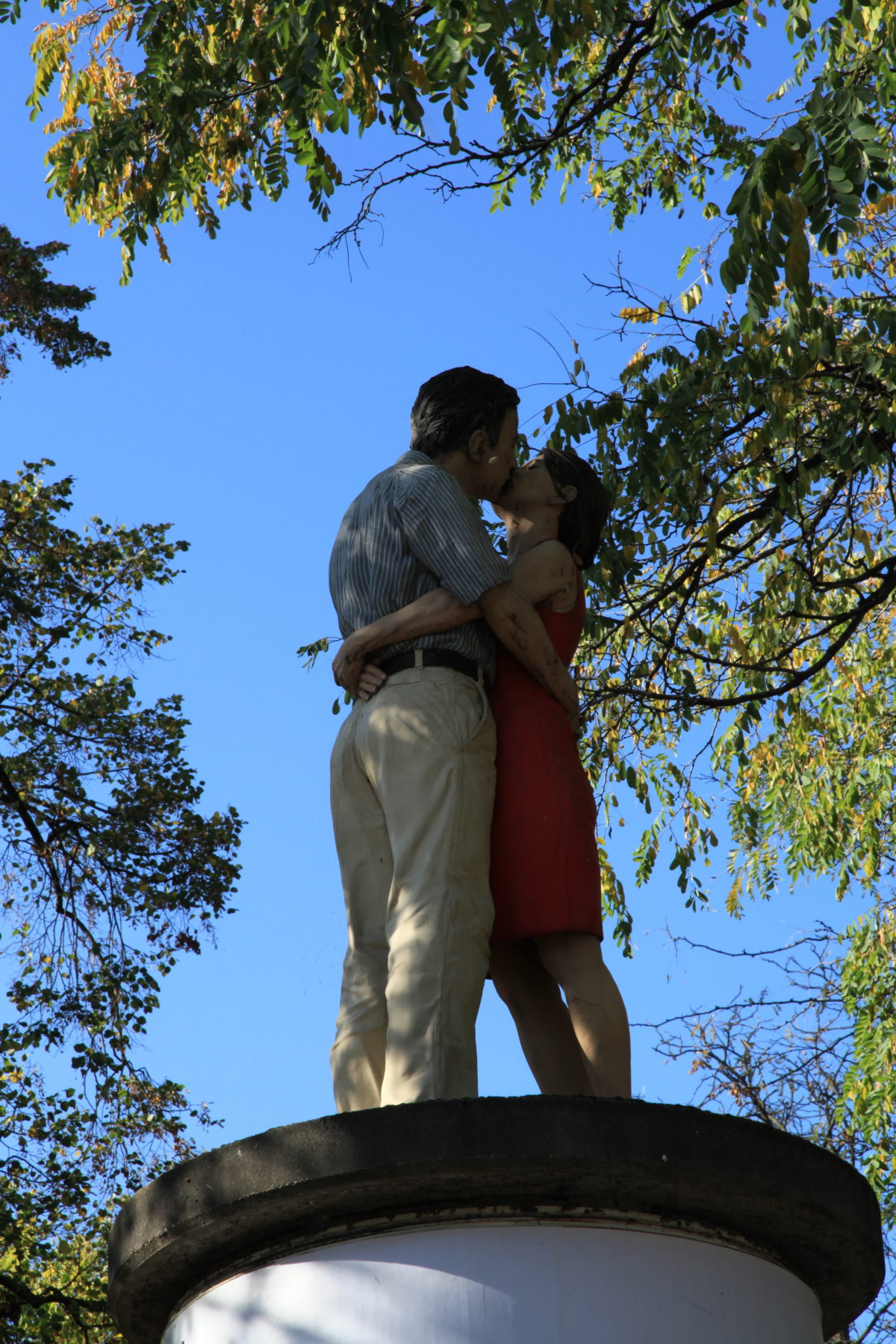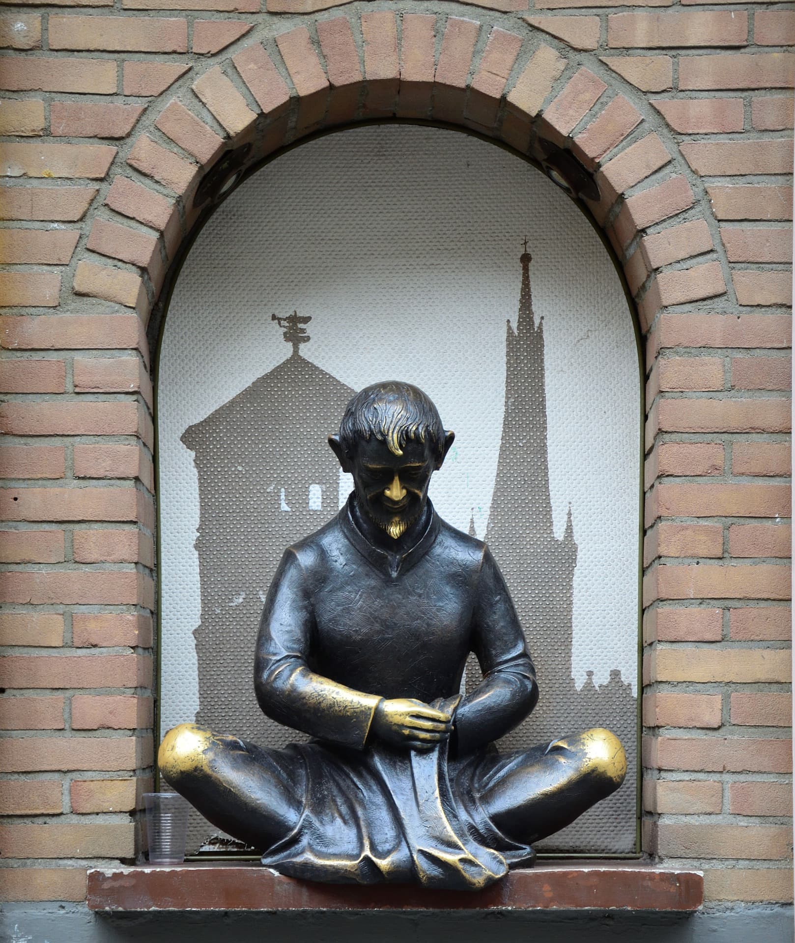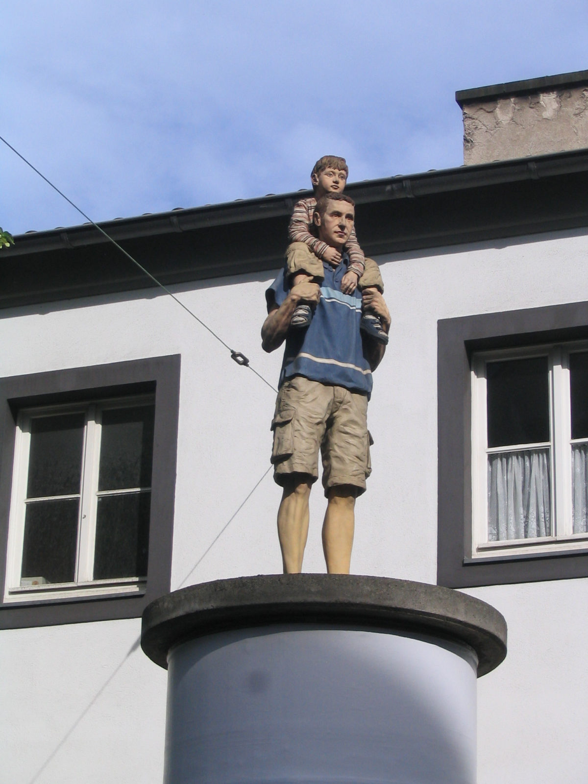 In der ganzen Stadt verteilt stehen insgesamt zehn Säulenheilige, die zusammen ein Werk des Künstlers Christoph Pöggeler ergeben. Es sind ganz alltägliche Figuren. Zum Beispiel Pärchen, Fremde, ein Fotograf, ein Geschäftsmann, die so über die Stadt wachen.