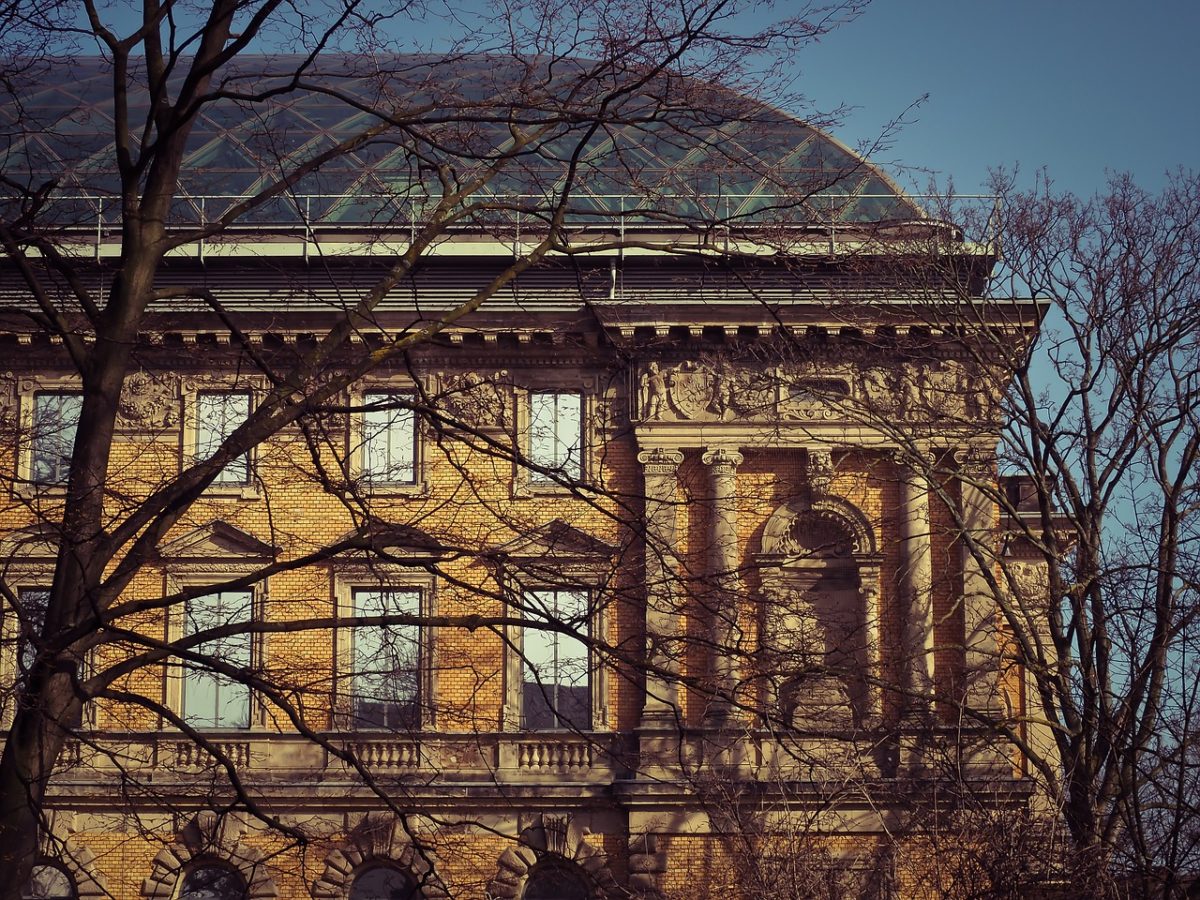 Das K21 Ständehaus war früher ein Parlamentsgebäude, später ein Tagunsgsort des Landtages und heute ein Teil der Kunstsammlung Nordrhein-Westfalen. Direkt am Kaiserteich gelegen, an der ehemaligen Festungsgrenze von Düsseldorf, ist es mit der Parkanlage bis heute ein schöner Foto-Standort. Geht ihr rein in das Ständehaus, könnt ihr unter der Kuppel in der Installation des Künstlers Tomás Saraceno sogar klettern gehen. Es ist ein begehbares Kunstwerk mit Stahlnetzen.