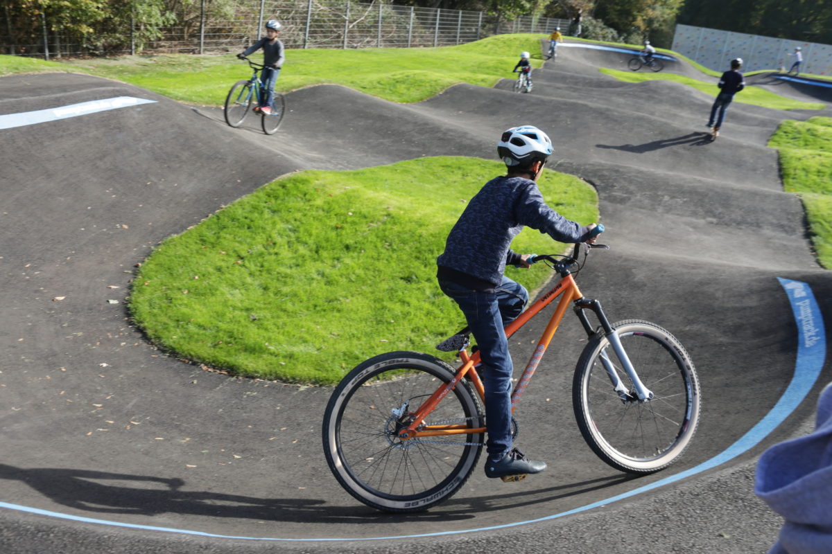 Was ein Pumptrack ist? Ganz einfach: ein Fahrrad-Rundkurs, der durch Drücken und Ziehen am Lenker ein Fortbewegen über Wellen, Steilkurven und damit auch Sprünge ermöglicht. Doch auch Inliner finden auf der asphaltierten Fläche ihren Spaß. Daneben befindet sich auch eine Boulderwand vor Ort und gleich in der Nähe kann Basketball oder Fußball gezockt werden.