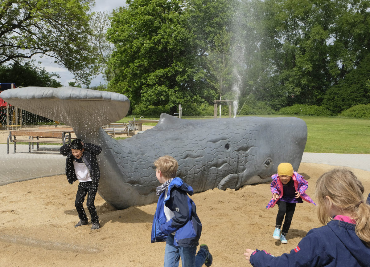Ebenfalls ein lustiger Spiel-Riese ist der Wasser spuckende Pottwal im Stadtteil Vennhausen an der Düssel. Auf diesem Spielplatz gibt’s daneben noch eine Wassermatschanlage sowie weitere Fontänen unter denen man sich vor allem im Sommer wunderbar erfrischen kann. Wandmotive im Meeres-Look lassen die Kids in eine Unterwasserwelt abtauchen. Rutschen sowie Klettergerüst und Boule-Bahn runden die Spieloase ab.