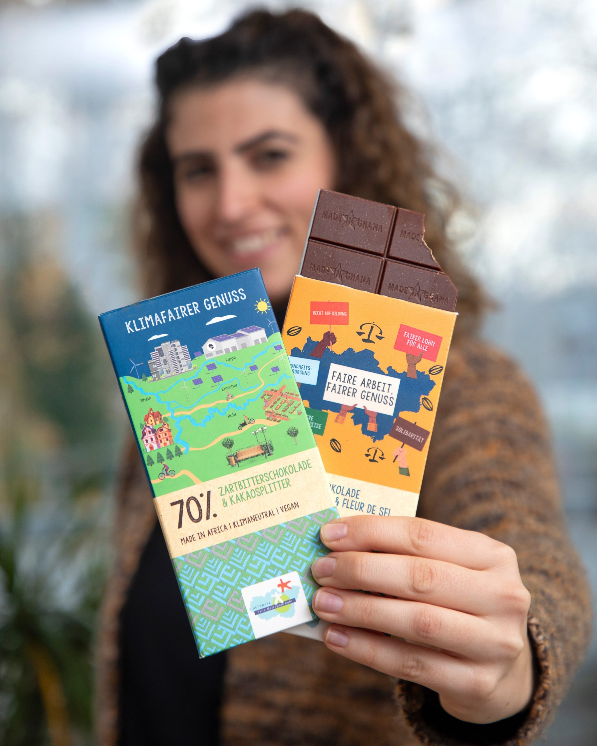 Wir haben Projektmanagerin Tamara Kaschek vom Netzwerk Faire Metropole Ruhr gefragt, warum die KlimaFaire Schokolade das perfekte Geschenk für Herzensangelegenheiten ist: „Im Gegensatz zu vielen anderen fairen Schokoladen wird bei uns nicht nur der Kakao fair produziert, auch alle weiteren Verarbeitungsschritte finden in Ghana statt. Das ist umweltfreundlicher und das Geld bleibt direkt bei den Menschen dort“, so Kaschek. Für sie ist eine Schokolade, die mit Wertschätzung entstanden ist, auch ein wertschätzendes Geschenk: „Sogar die Folie um unsere Schokolade ist umweltfreundlich. Unsere Schokolade ist teurer, weil sie den Anbau und die Arbeit in Ghana würdigt. So tut man beim Kauf der Schokolade schon etwas Gutes. Unsere Schokolade ist eine Herzensangelegenheit. Nicht nur durch das Verschenken tut man was Gutes, sondern direkt beim Kauf.“