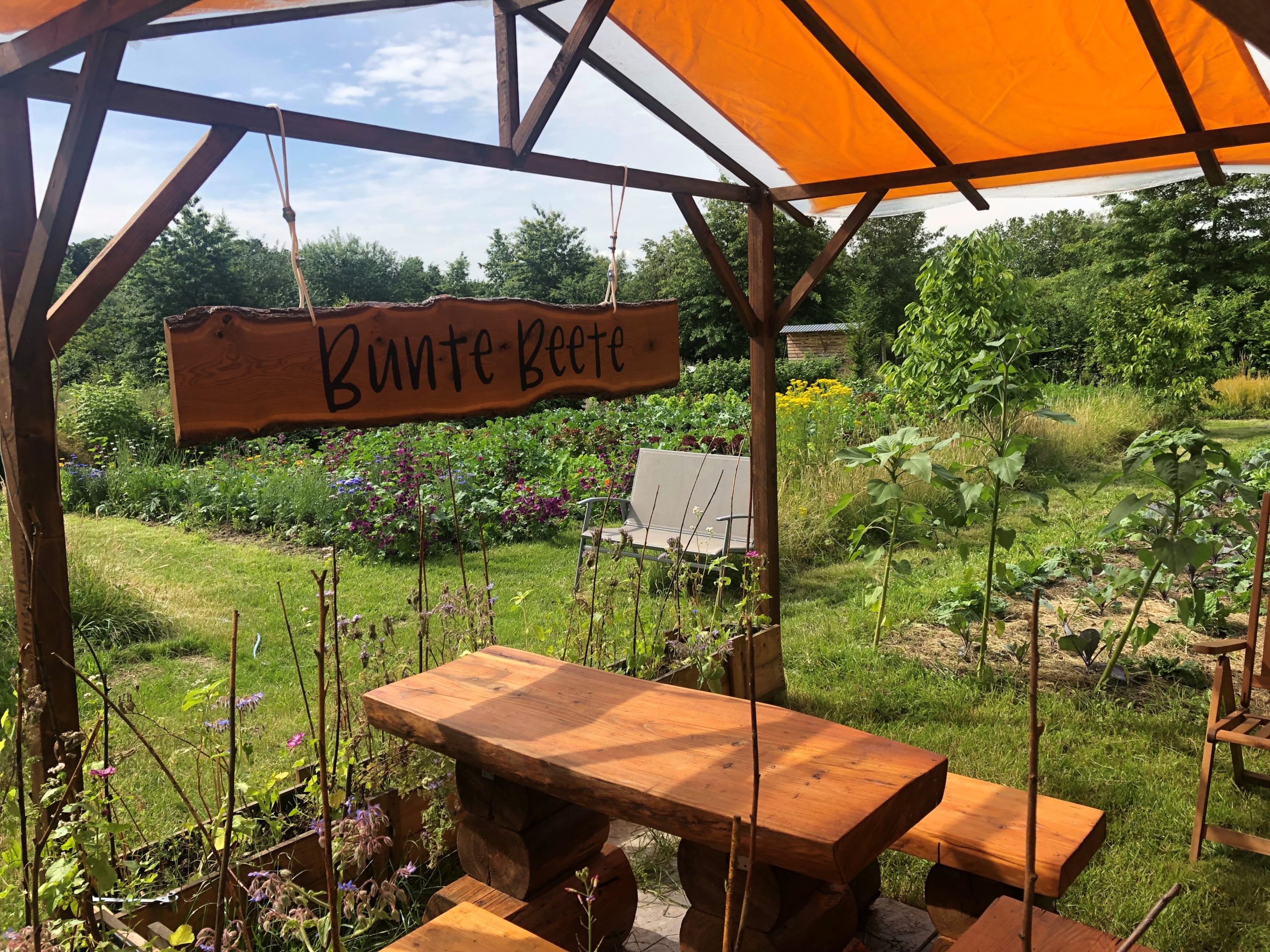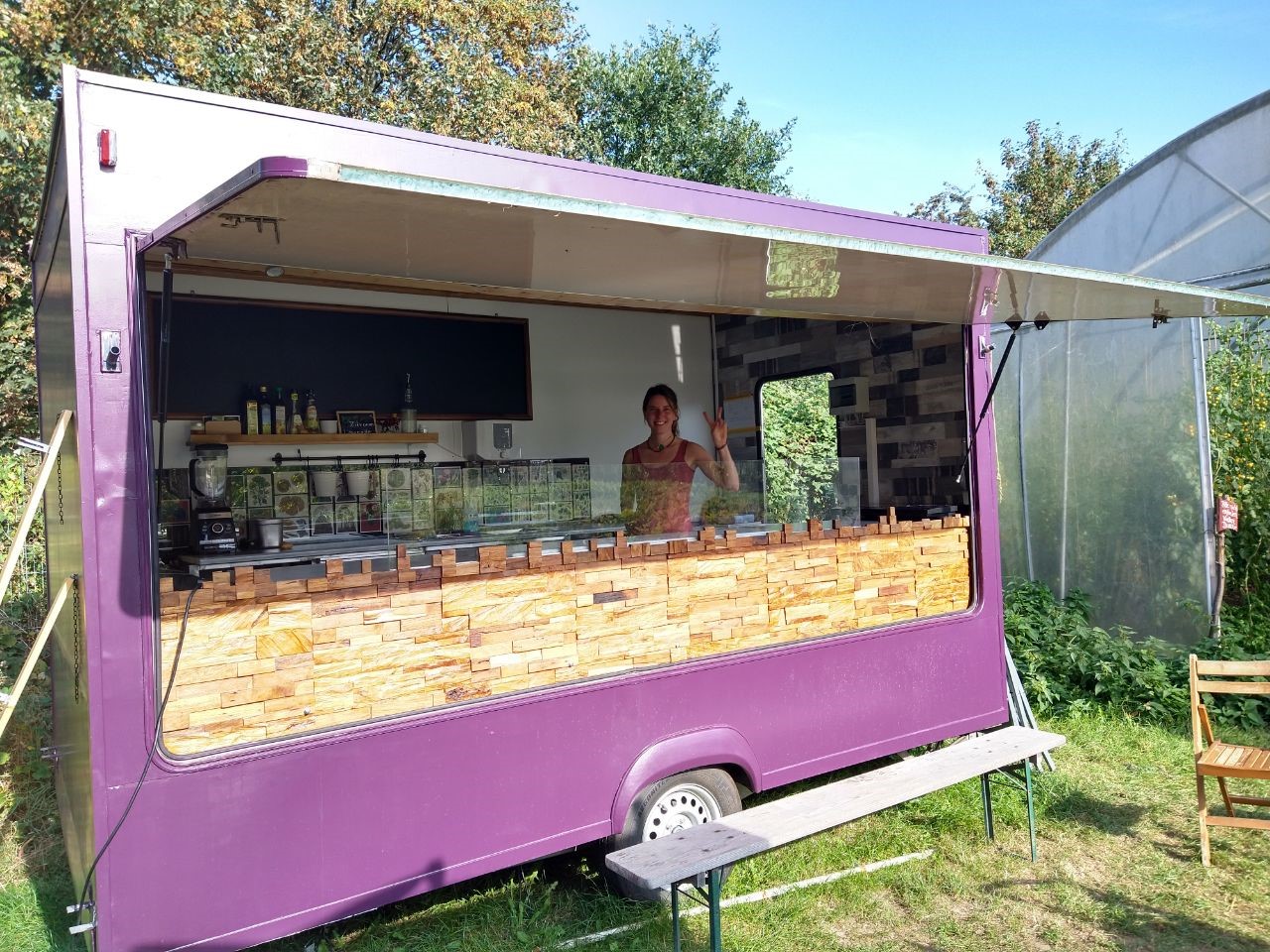 Das neueste Projekt ist nun eine gastronomische Nutzung. Schon mal einen Salat gegessen aus Mitzuna (japanischem Stielmus), aus asiatischen Braunsenfsorten, Brunnenkresse, Borretschblüten, Kapuzinerkresseblüten und -blättern, mariniertem Mangold, Mauretanischer Malve, Ringelblume, Möhren „Purple Haze“ in lila-gelber Farbvariation und Blattsalaten wie Salanova, Multigreen,Lollobiando und Lollorosso? Das wächst hier alles und Svenja Kronauer von „Bunte Beete“ hat ihn gemacht. Sie ist jüngster Neuzugang hier und wollte hauptsächlich ihren Food-Anhänger „Bunte Beete“ hier abstellen. Nun wird sie jeden Samstag und Sonntag, wenn hier Publikum kommen kann, überwiegend vegane Snacks anbieten, die quasi unmittelbar vor Ort wachsen.