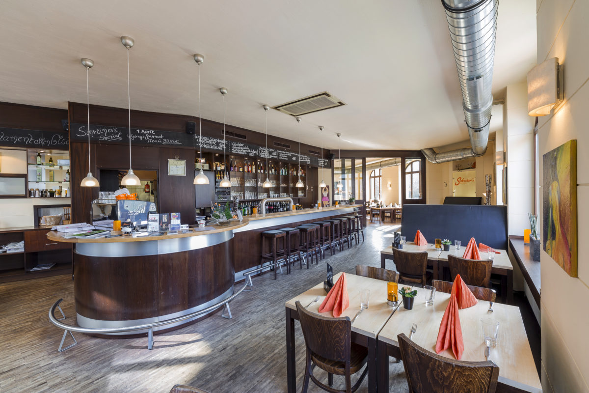 Don’t judge a book by its cover – das gilt auch für dieses Restaurant. Nicht unbedingt malerisch gelegen, hinter dem neuen Musikzentrum, entfaltet die Gastronomie im Kolpinghaus seinen vollen Glanz, nachdem man durch die Tür getreten ist: Kupfer-golden glänzend, Holz, Grün und Frischblumen – sehr einladend wirkt der Gastraum, in dem das hervorragende Service-Team die mit großer Perfektion zubereiteten Gerichte präsentiert. Klassiker der Sonntagsküche wie Medallions, Filets und Schnitzel oder Braumeister-Steak und Zürcher Geschnetzeltes – diese Küche beherrscht ihr Handwerk präziser Kochkunst und verdient es, mehr im Fokus zu stehen.